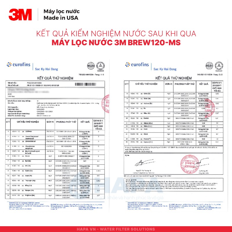 - 3M BREW120-MS đạt các tiêu chuẩn chứng nhận quốc tế NSF, WQA, Viện Pasteur và Chuẩn nước uống đóng chai của Bộ Y Tế.