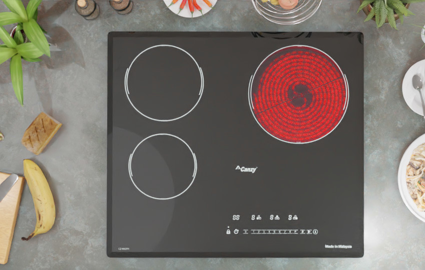 Bếp điện từ 3 lò cảm ứng CANZY CZ-86GHP, có Mặt kính Vitro Ceramic Dòng bếp Nhập khẩu nguyên chiếc 100% từ Malaysia, thuộc dòng bếp điện từ cao cấp của thương hiệu thiết bị nhà bếp nổi tiếng CANZY, là sự kết hợp hoàn hảo giữa 2 bên bếp từ (sử dụng các bộ nồi chảo inox từ, tiết kiệm điện và đun nấu nhanh hơn) và 1 bên bếp điện hồng ngoại (không kén nồi và có thể nướng trực tiếp trên bề mặt bếp), 3 vùng nấu hỗn hợp (2 từ, 1 điện) phù hợp với gia đình đông thành viên và có không gian nhà bếp rộng. giúp cho cuộc sống của bạn thuận tiện hơn.