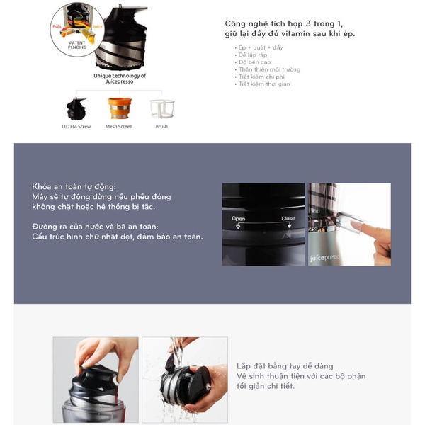 Máy Ép Chậm Coway CJP-03 Juicepresso điều khiển thuận tiện bằng một nút nhấn với công nghệ ép chậm từ đó cho ra rất ít bả, bả khô giữ nguyên hương vị, cho nước ép nhiều, sánh mịn hơn máy ép thường rất nhiều, giúp tiết kiệm nguyên liệu, giảm chi phí. Coway CJP-03 có cấu tạo 3 cối để ép trái cây liền nhau, không tháo rời nên hệ thống ép rất bền và chắc chắn, được làm từ nhựa nguyên sinh cao cấp, có khớp tháo lắp an toàn khi sử dụng và vệ sinh rất tiện lợi. Máy còn có lưới lọc mịn cùng với bộ phận dùng để ép bằng thép bền lâu không gỉ sét.