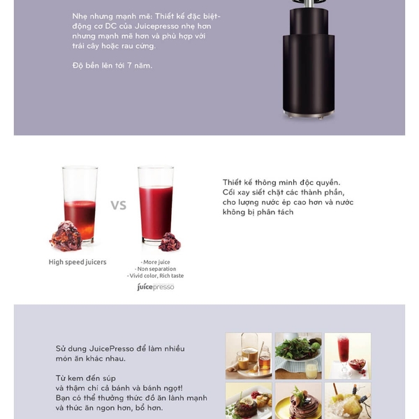 Sử dụng công nghệ ép 3 trong 1 mới, quay và sàng lọc cho nước ép nhiều hơn. Công nghệ ép thông minh trong Máy Ép Chậm Coway CJP-03 Juicepresso làm cho các thành phần trong nước ép ra không bị tách riêng biệt, giúp giữ lại hơn 90% lượng vitamin, trọn hương vị và màu sắc của nguyên liệu. Máy phù hợp cho nhiều loại trái cây, rau củ quả. Khi đó bạn sẽ có được những ly nước ép cực kỳ thơm ngon, sánh mịn, hoàn toàn không có bọt, mang lại sự bổ ích tối đa cho sức khỏe của các thành viên trong gia đình bạn.