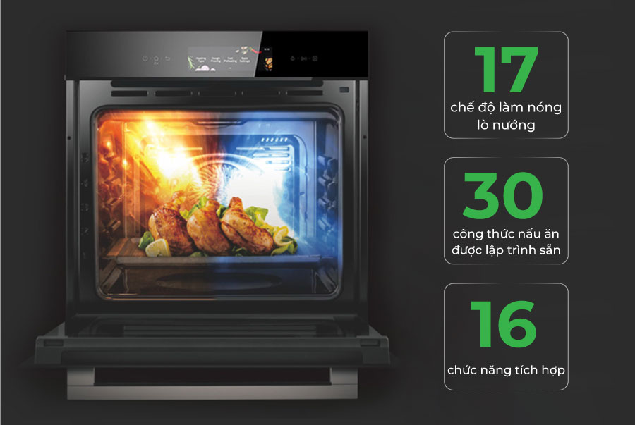♦ 16 Chức năng tích hợp: Đèn, Thông thường, Nhiệt bức xạ, Nướng đôi, Nướng đôi + Quạt, Nhiệt dưới / Nướng, Quạt thông thường + Quạt, Đối lưu, Pizza, Giữ ấm, Sấy khô, Rã đông, Tấm giữ ấm, ECO, Lên men, Làm nóng chậm;