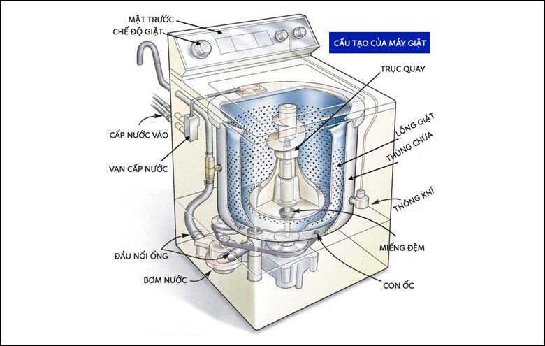 Máy giặt có cấu tạo gồm nhiều bộ phận khác nhau, mỗi bộ phận đảm nhiệm một chức năng nhất định để đảm bảo quá trình giặt diễn ra hiệu quả. Dưới đây là các thành phần chính trong một máy giặt thông thường: