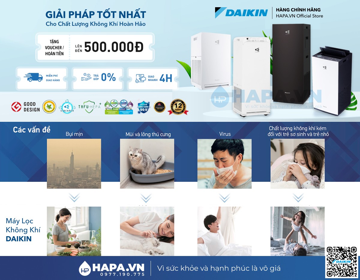 - Tất cả Máy Lọc Không Khí DAIKIN mua tại HAPA đạt tiêu chuẩn chất lượng với đầy đủ giấy tờ và chính sách bảo hành chính hãng.