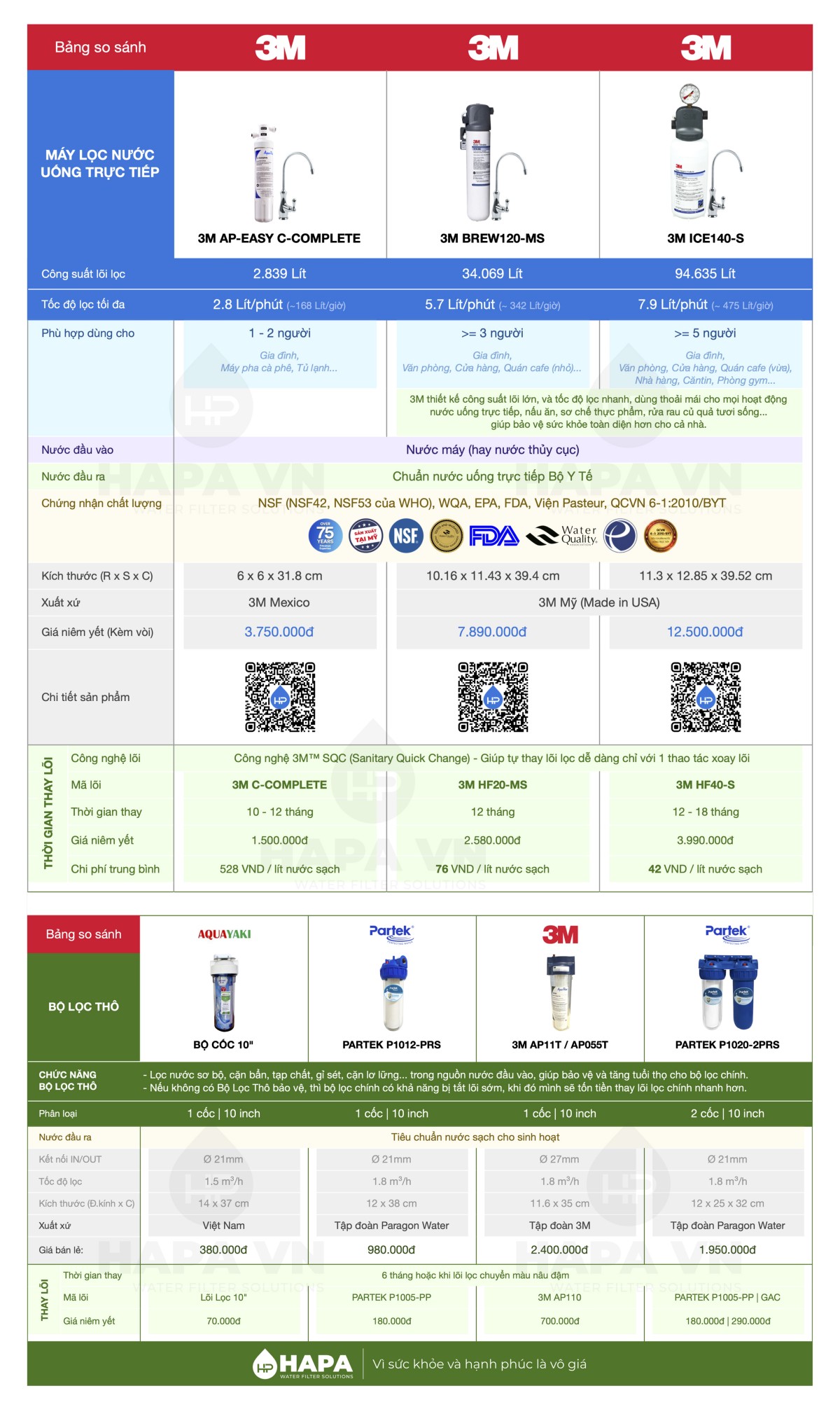 - 3M AP-EASY | 3M BREW 120-MS | 3M ICE140-S với công nghệ lọc nước I.M.P.A.C.T độc quyền (còn gọi là NANO 3M Mỹ), gồm 4 cấp lọc cao cấp tích hợp trong 1 lõi nguyên khối.