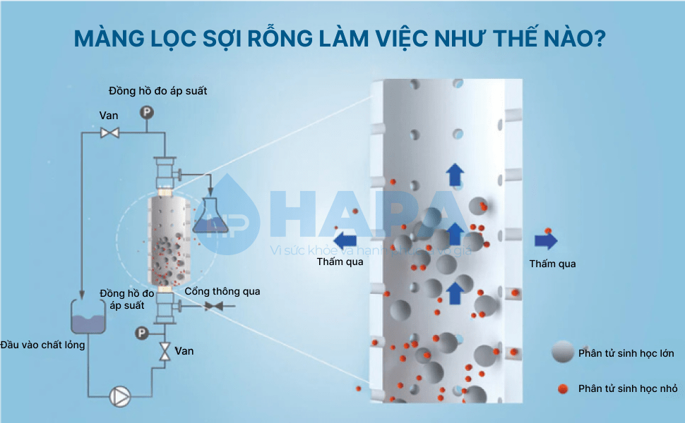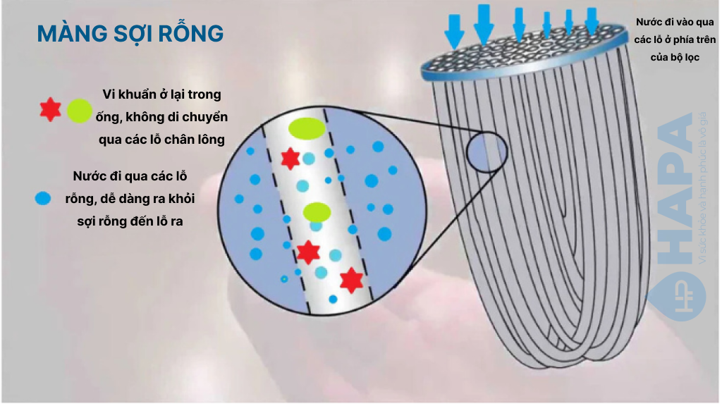 Màng sợi rỗng cấu trúc như một ống hút rỗng, đường kính vài trăm microns độ dày vài chục microns, trên bề mặt có vô số các khe lọc kích thước nhỏ đến 0.1 microns tác dụng loại bỏ hạt và vi khuẩn trong chất lỏng.