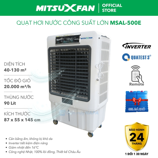 Quạt hơi nước công nghiệp Mitsuxfan MSAL-500E là thiết bị làm mát công suất lớn, phù hợp cho những không gian rộng như nhà xưởng, kho hàng, quán cà phê ngoài trời, nhà hàng và hội trường. Với lưu lượng gió mạnh mẽ lên đến 50.000 m³/h, quạt có khả năng làm mát diện tích lớn từ 150 – 200m², giúp giảm nhiệt nhanh chóng và mang lại không gian thoáng mát, dễ chịu.